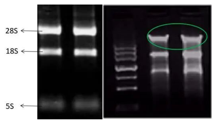 图2. 高质量RNA(左)和RNA中有gDNA(右)